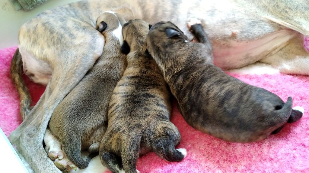 Der C Wurf kam am 18.12.2014 zur Welt. Es wurden „kennfarbige“ Welpen drei schwarzgestromte Jungs und vier blaugestromte Mädels geboren.