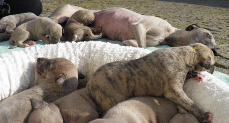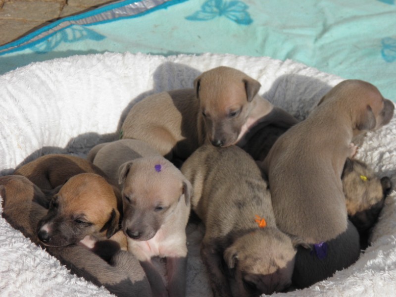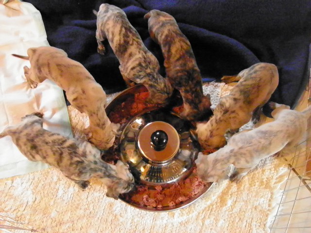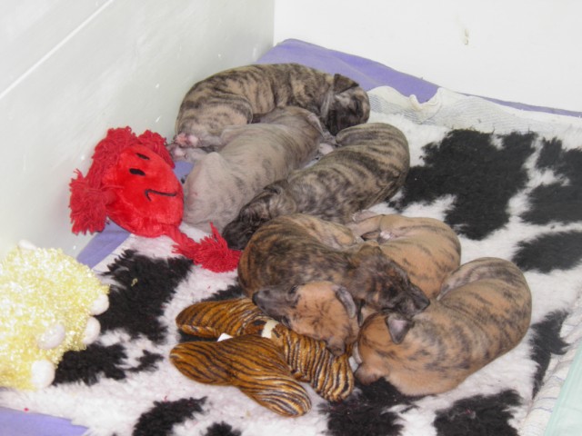 v.l.n.r.: bei Mama 1.Rüde, 4 Hündinnen,im Vordergrund links 2.Rüde