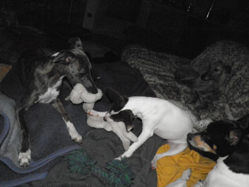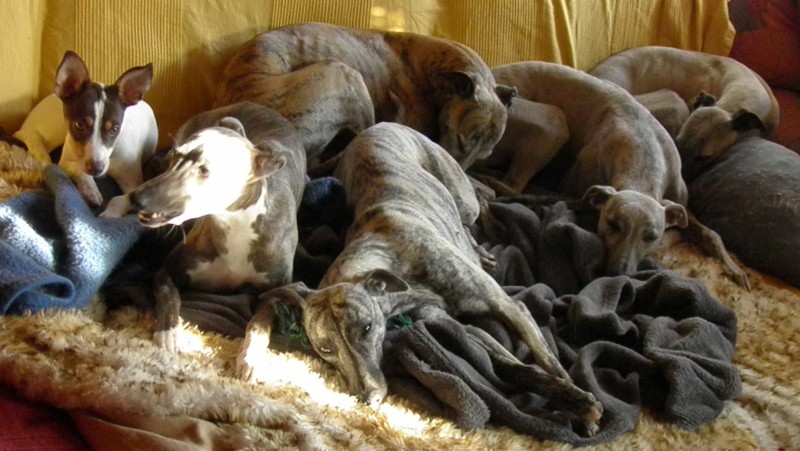 In der Praxis ist Rosaura unauffällig wie immer, sie verschläft den gesamten Vormittag und gibt sich ansonsten sehr süüüüß. Jeder ist angetan von ihr, aber es hat sich noch kein ernsthafter Interessent gefunden. Gestern war Rosaura während eines längeren Spaziergangs zwischengeparkt, bei dem Sohn einer guten Bekannten, Luzie, mit der ich den Hundespaziergang gemacht habe. Wir waren mit 6 Hunden unterwegs: Luzies Manchester Terrierdame Tiny, dem Jack Russel Attila, unseren drei Whippetdamen Éowyn, Abhisheka und Gloria und natürlich Nando. Es war ein schöner Weg, wo die Hunde die meiste Zeit offline sein durften.