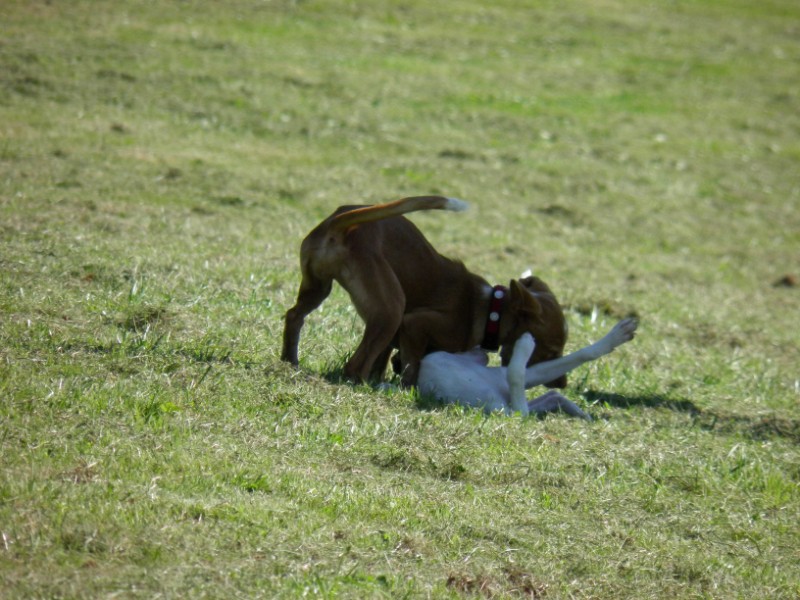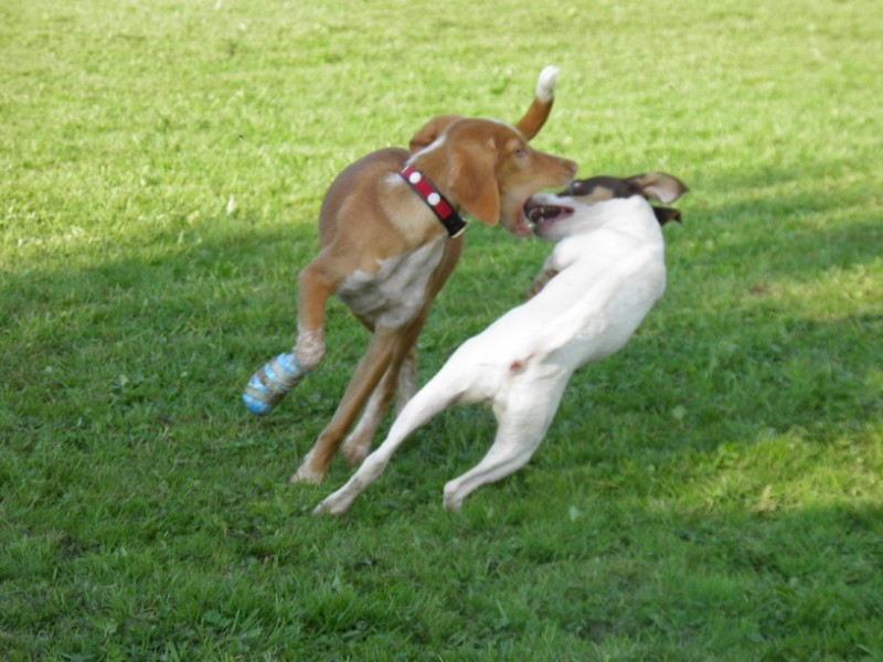 Pepita ist eine ganz Harte: beim Toben mit dem Rudel wurde sie von Gloria mit einem Schultercheck ziemlich heftig umgerannt. Pepita fiel, stand auf, und nach 2 Schritten fing sie stark an zu lahmen und laut zu winseln - oh Shit, da ist wohl was Ernstes passiert. Ich sah mich schon beim Tierarzt sitzen... aber zuerst hab sie auf den Arm genommen, das Bein von oben bis unten abgetastet und ihr gesagt, dass es nicht so schlimm sei. Es war kein Zucken von Pepita zu provozieren und nach 2 Minuten auf dem Arm hat sie sich von dem Schreck wieder so weit erholt, dass sie wieder runter zu ihren Kumpels wollte. Kaum zu glauben, aber keine fünf Minuten nach diesem Zwischenfall rannte sie wieder mit den Großen wie vorher...