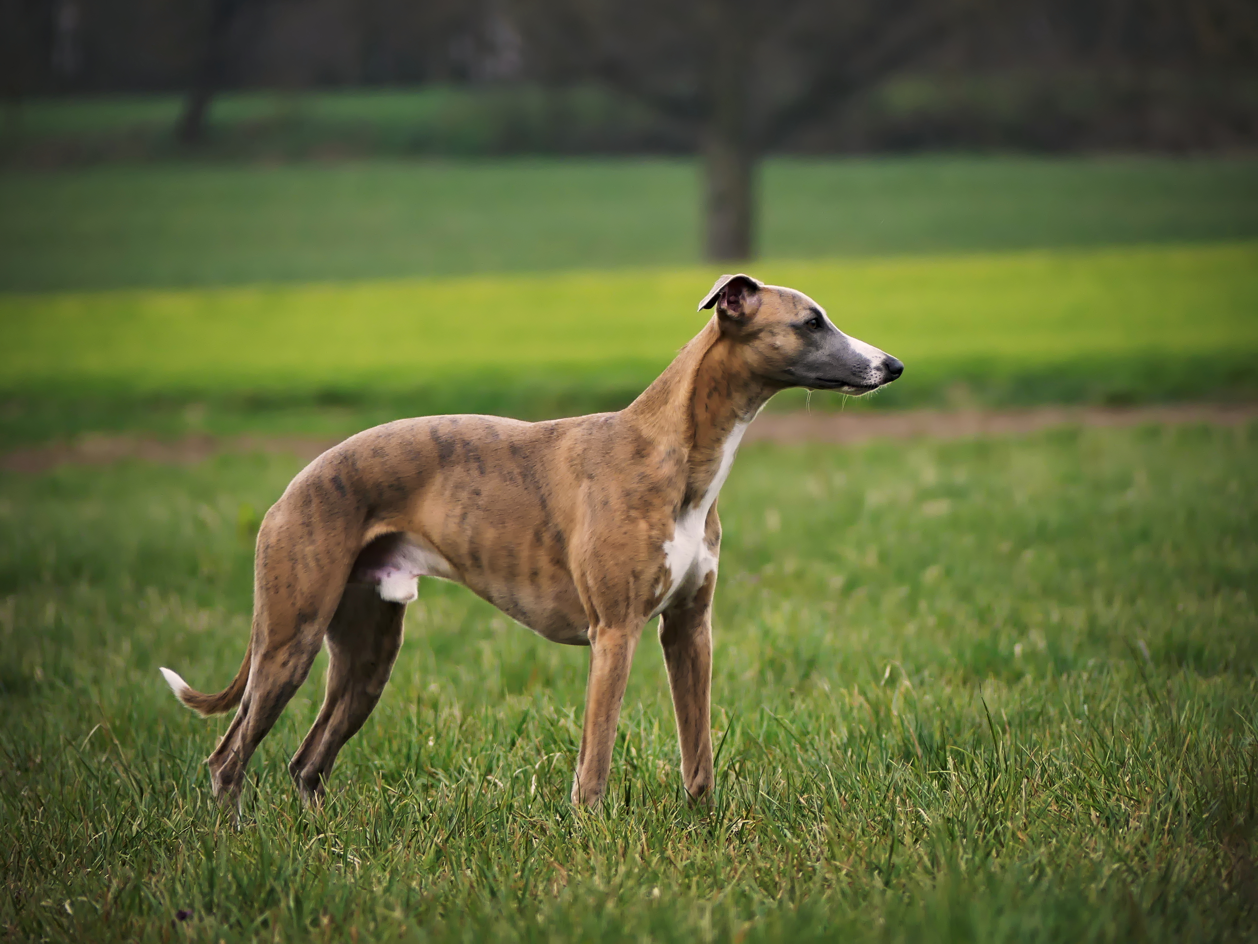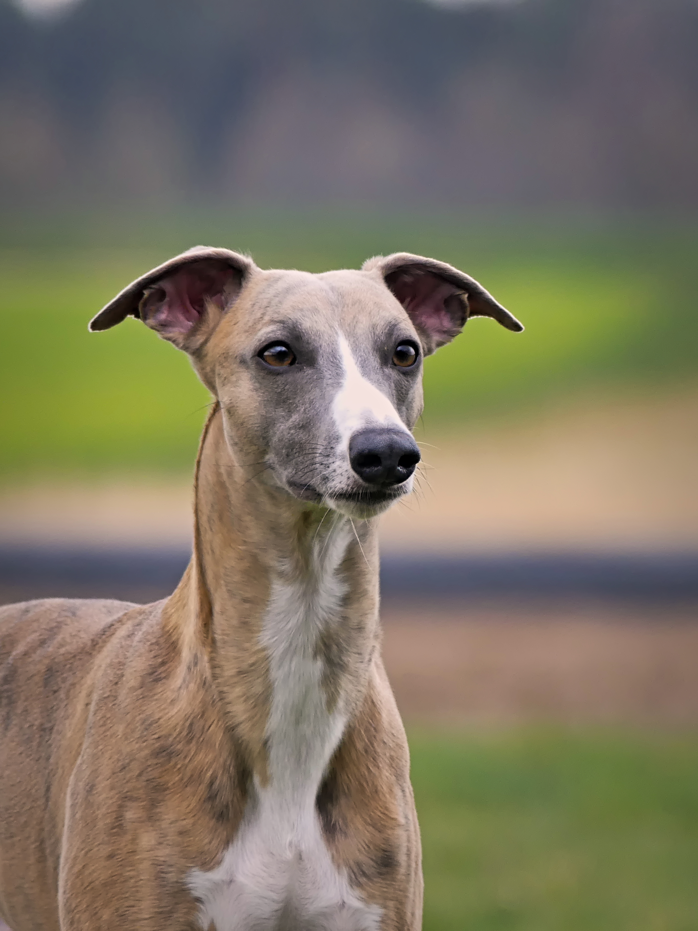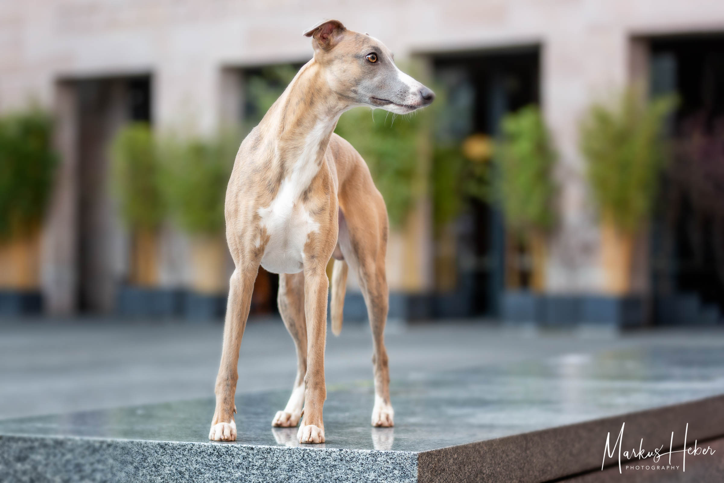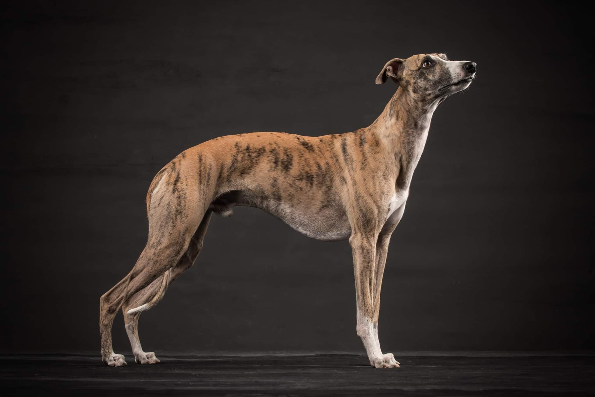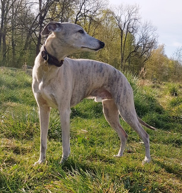 Er ist ein Whippet, wie er im Buche steht..alltagstauglicher Begleiter, egal ob im Büro, beim Friseur oder im Restaurant, elegant, unauffällig und geduldig und zuhause der anschmiegsame, verschmuste treue Sofa- und Bettgenosse.