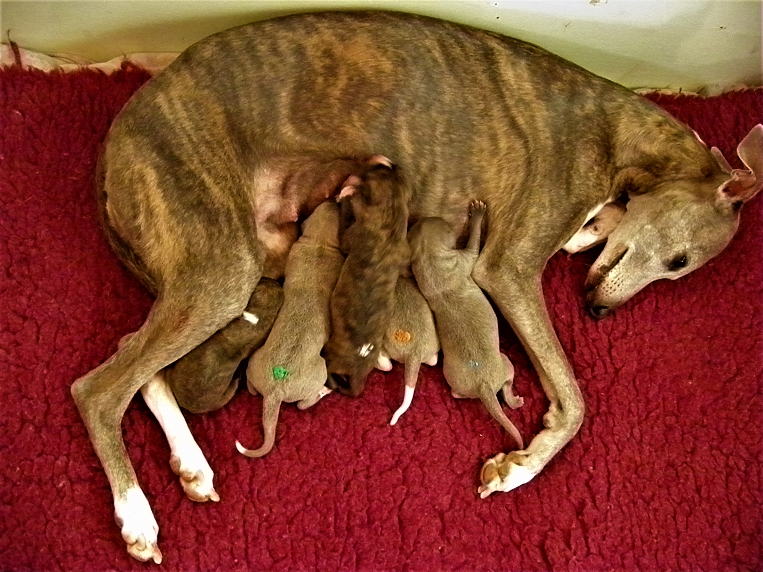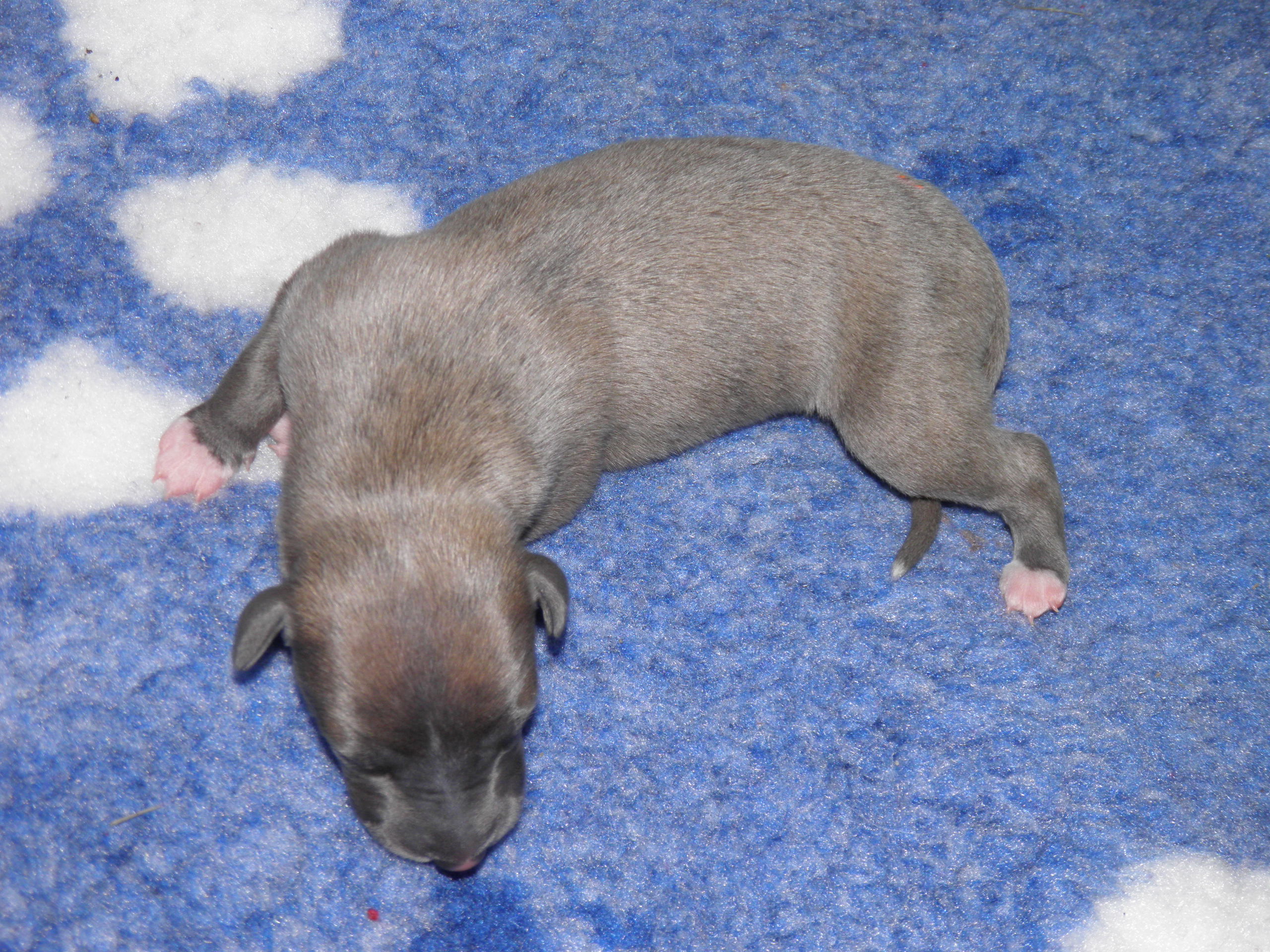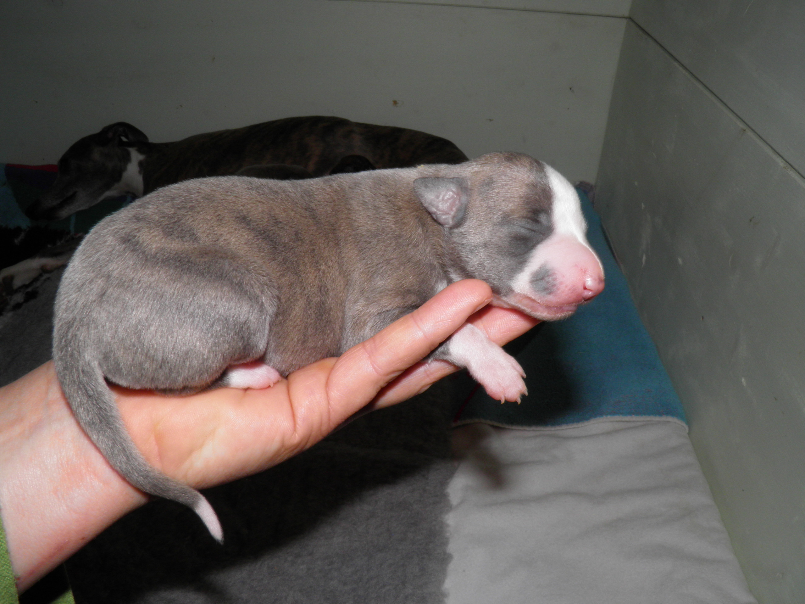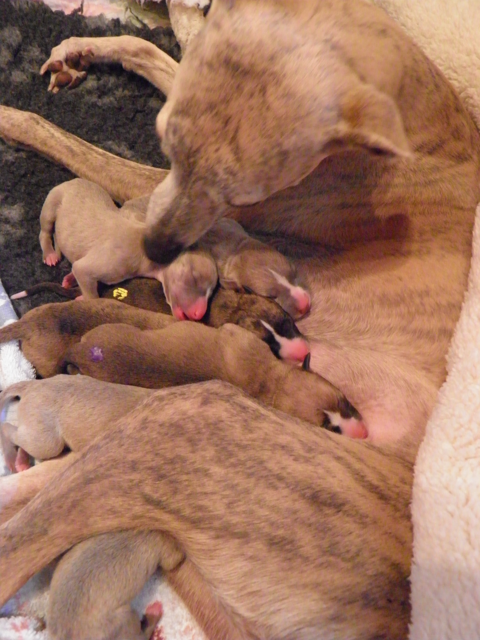 Der Pallid Dragon C-Wurf hat sich überaus gut entwickelt, so dass wir für den E-Wurf unsere Windmeister's Graceful Gloria ein weiteres Wir erwarten eine sehr bunte (gestromt, evtl. einfarbig oder gescheckt) Nachzucht - dies als Info für die Leute, denen die Farbe wichtig ist Gloria wurde am 12. & 13. März, in dessen Heimat Dänemark, von Newkins Shannon gedeckt. Gloria hat am 09.05.2018 in hoher Geschwindigkeit ihre 5 Welpen, vier Rüden und eine Hündin, zur Welt gebracht, dass man kaum mit Wiegen und Markieren hinterher kam. Es sind drei blaupigmentierte Rüden, davon ein wunderschöner leicht blaugestromter Mantelschecke, zwei Blauströmlinge mit weißen Abzeichen, ein schwarzgestromter Rüde und eine schwarzgestromte Hündin.