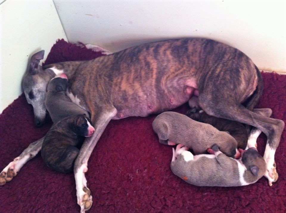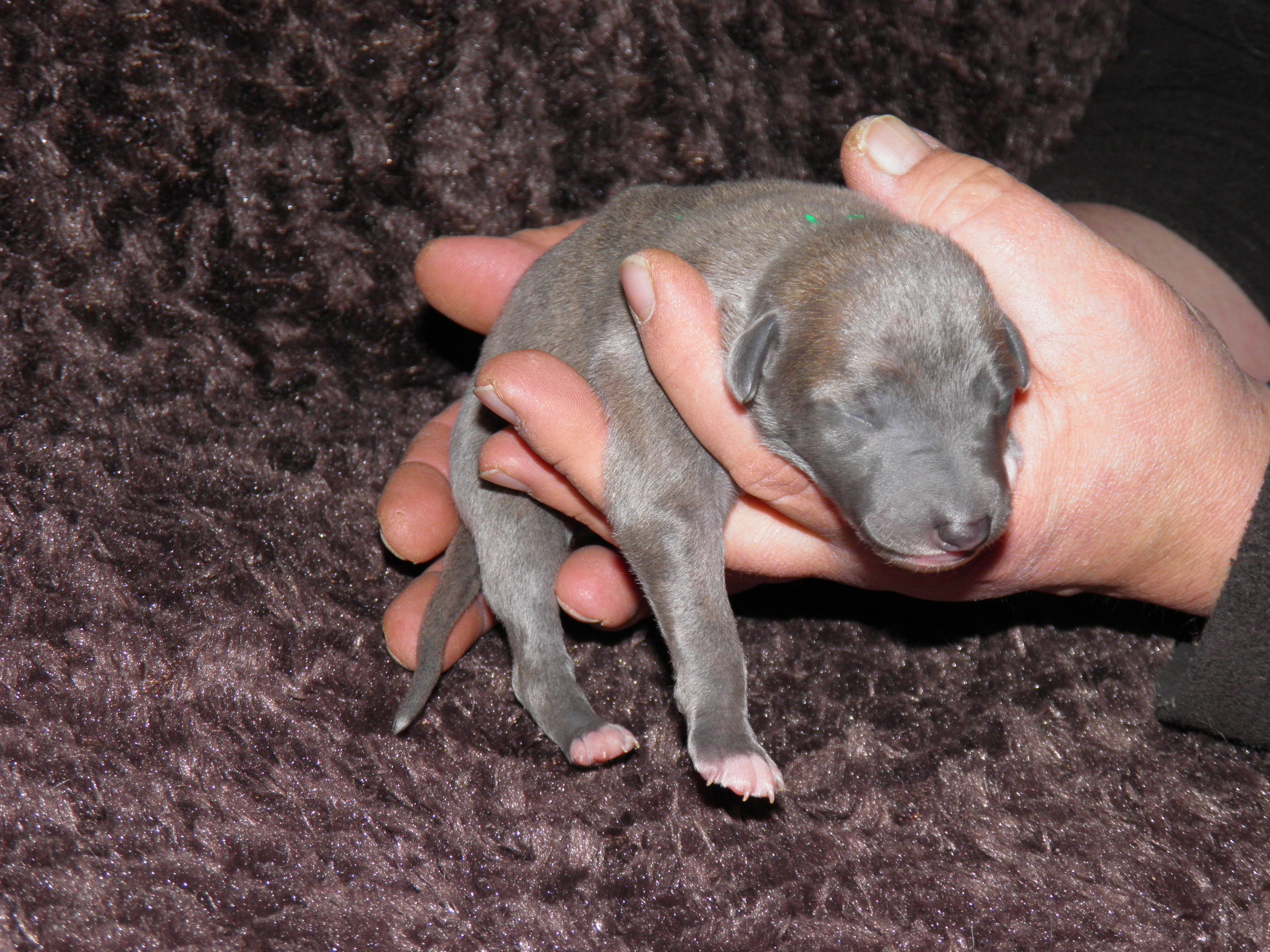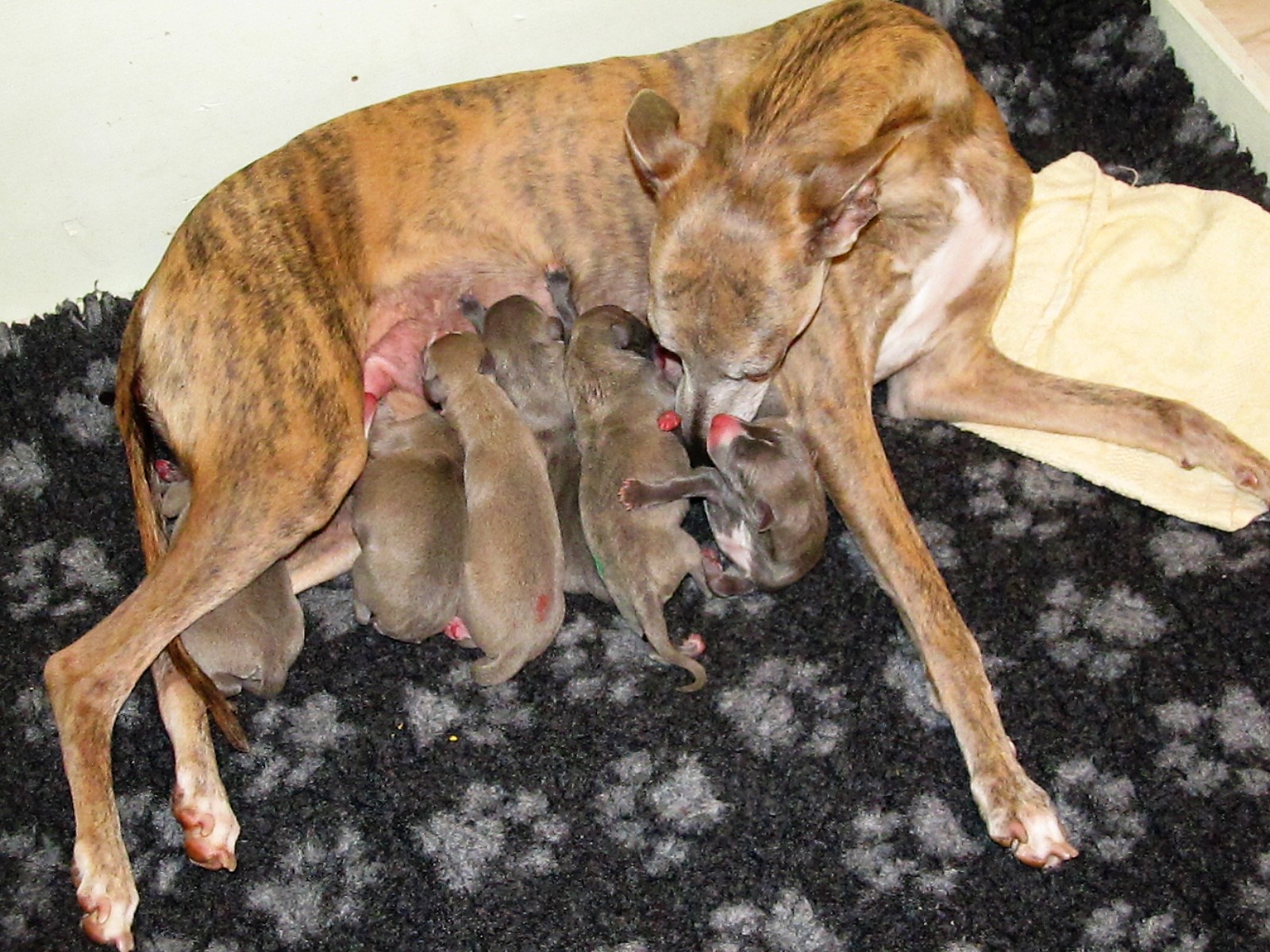 Der Pallid Dragon C-Wurf hat sich überaus gut entwickelt, so dass wir für den E-Wurf unsere Windmeister's Graceful Gloria ein weiteres Wir erwarten eine sehr bunte (gestromt, evtl. einfarbig oder gescheckt) Nachzucht - dies als Info für die Leute, denen die Farbe wichtig ist Gloria wurde am 12. & 13. März, in dessen Heimat Dänemark, von Newkins Shannon gedeckt. Gloria hat am 09.05.2018 in hoher Geschwindigkeit ihre 5 Welpen, vier Rüden und eine Hündin, zur Welt gebracht, dass man kaum mit Wiegen und Markieren hinterher kam. Es sind drei blaupigmentierte Rüden, davon ein wunderschöner leicht blaugestromter Mantelschecke, zwei Blauströmlinge mit weißen Abzeichen, ein schwarzgestromter Rüde und eine schwarzgestromte Hündin.