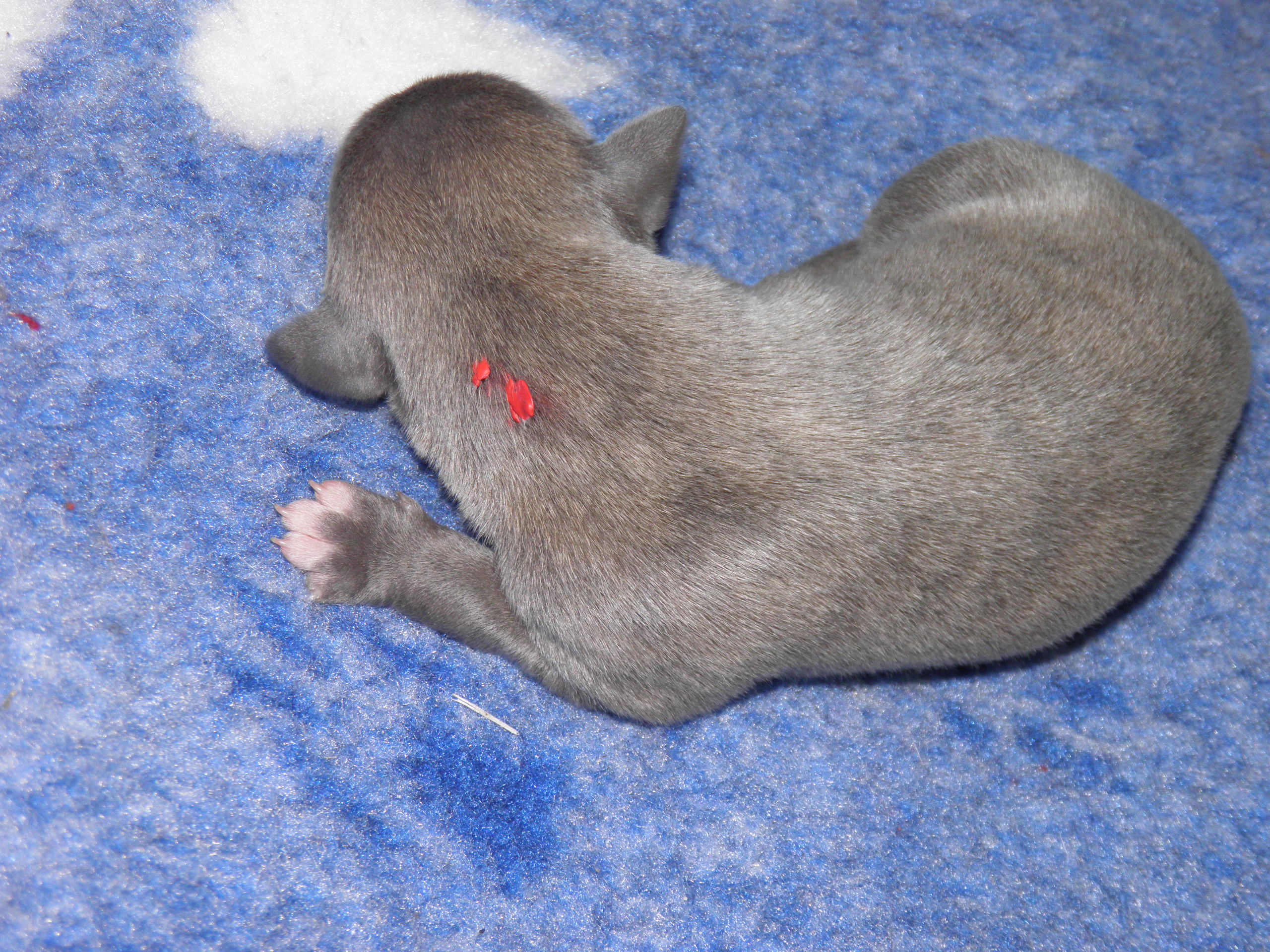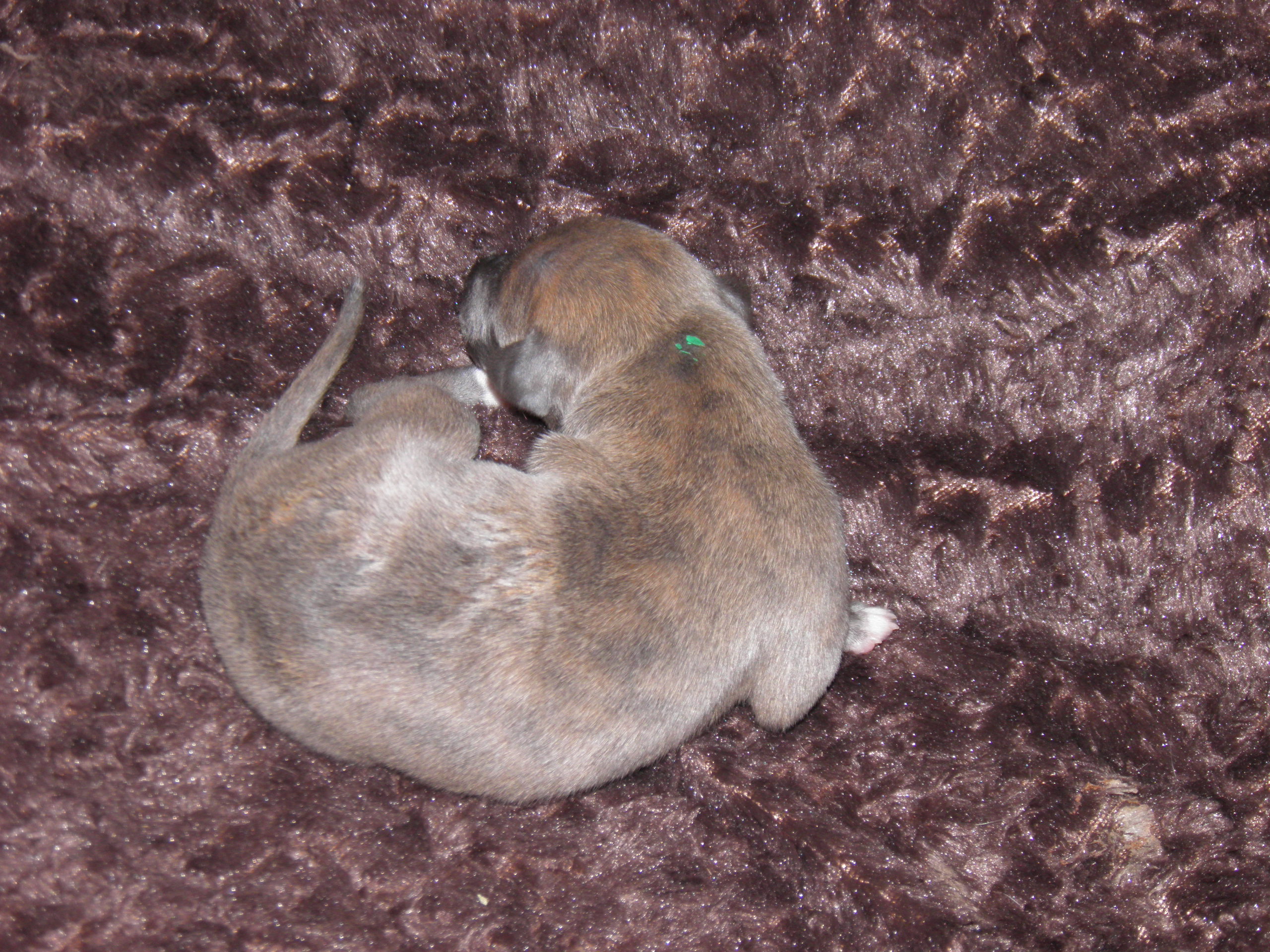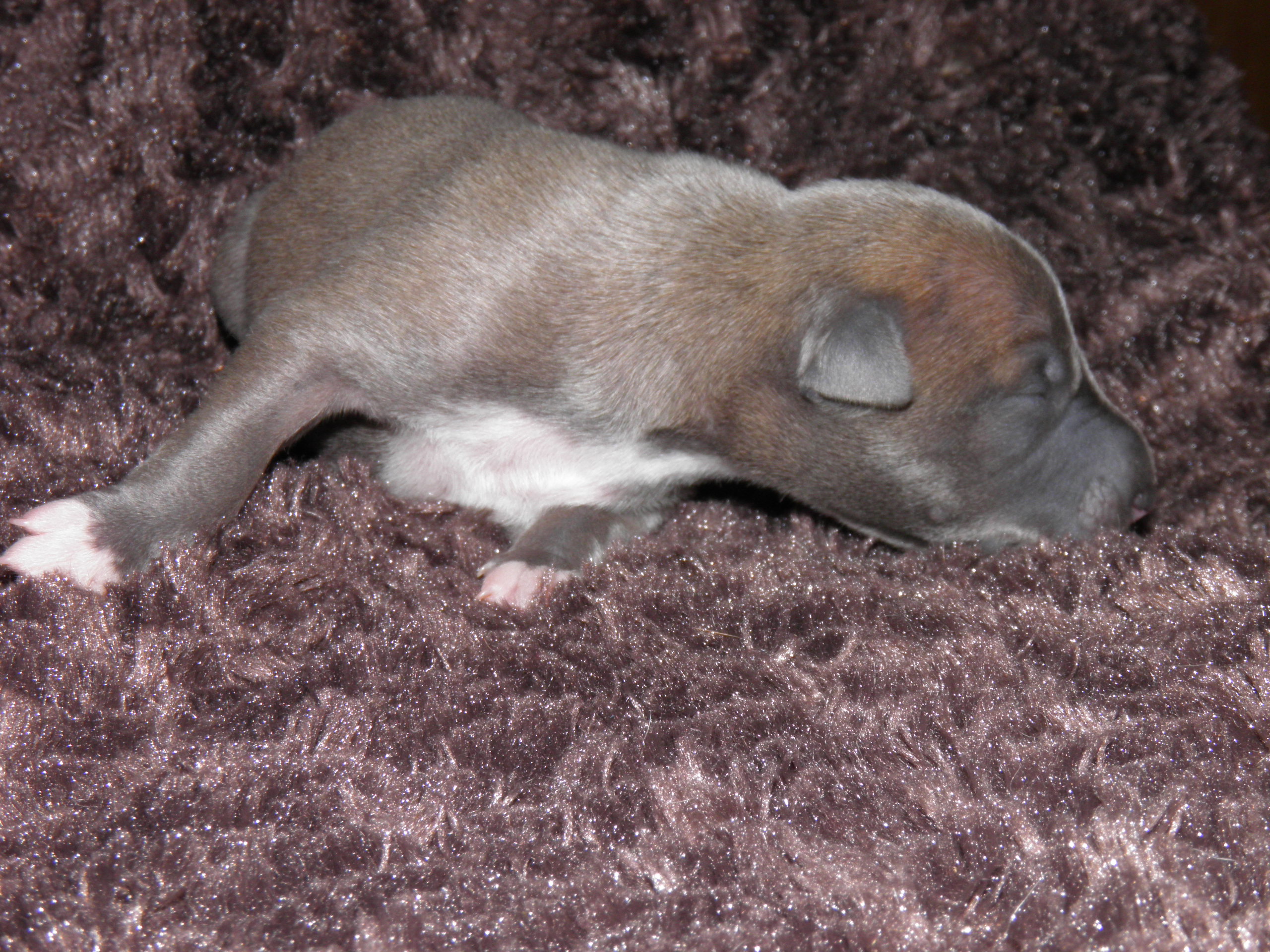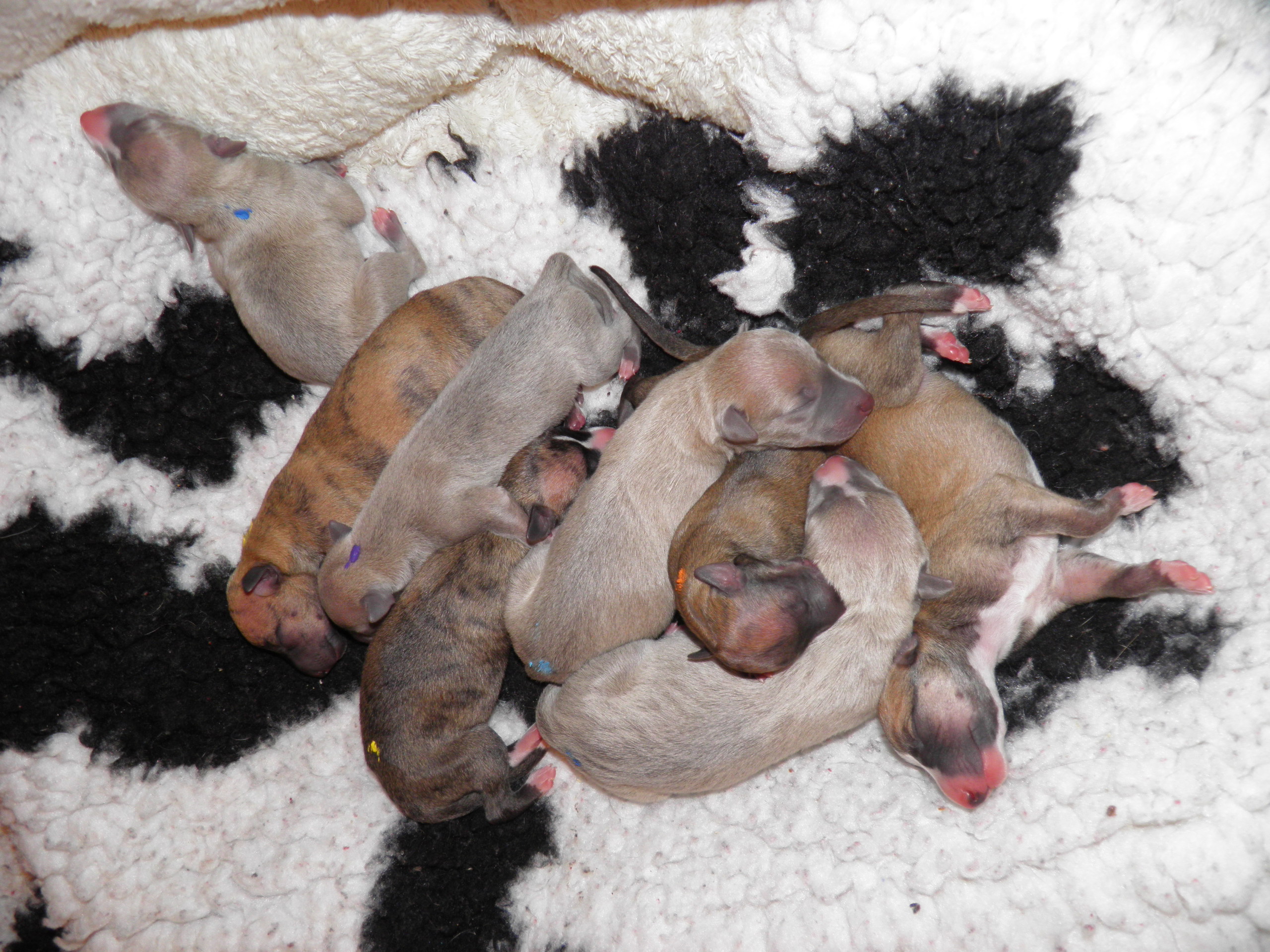 Und hier sind sie schon! 3 Rüden und 4 Hündinnen sind am Mittwoch, dem 09. November in der Zeit zwischen 19.08 und 00.00 geboren worden. Leider haben wir auch einen Verlust zu beklagen, Welpe Nummer acht, ein Rüde in bluefawn, kam traurigerweise nur tot zur Welt.
