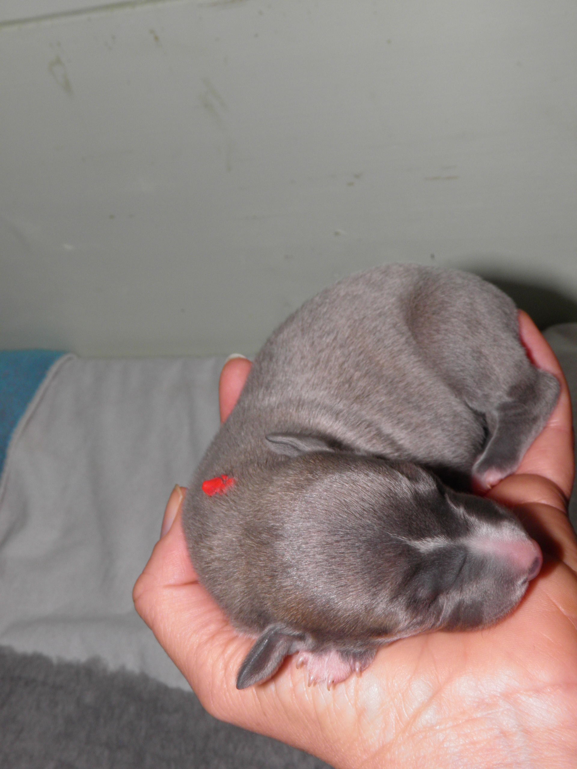 Dummerweise kam der Erste mit dem Po zuerst, es war nur ein Hinterbein sichtbar, und ich traute mir eine entsprechende Hilfe nicht zu. So bin ich mit unserer bewährten Hebamme/moralischem Beistand/Chauffeurin in die Praxis gedüst. Dort wurde der dicke "Martin Spoonman" mit Hilfe unserer Tierärztin und einer Ladung Gleitgel zur Welt geholt und wir mit den Worten "den Rest schafft ihr alleine" wieder in die Drachenhöhle geschickt. Und so war es dann auch