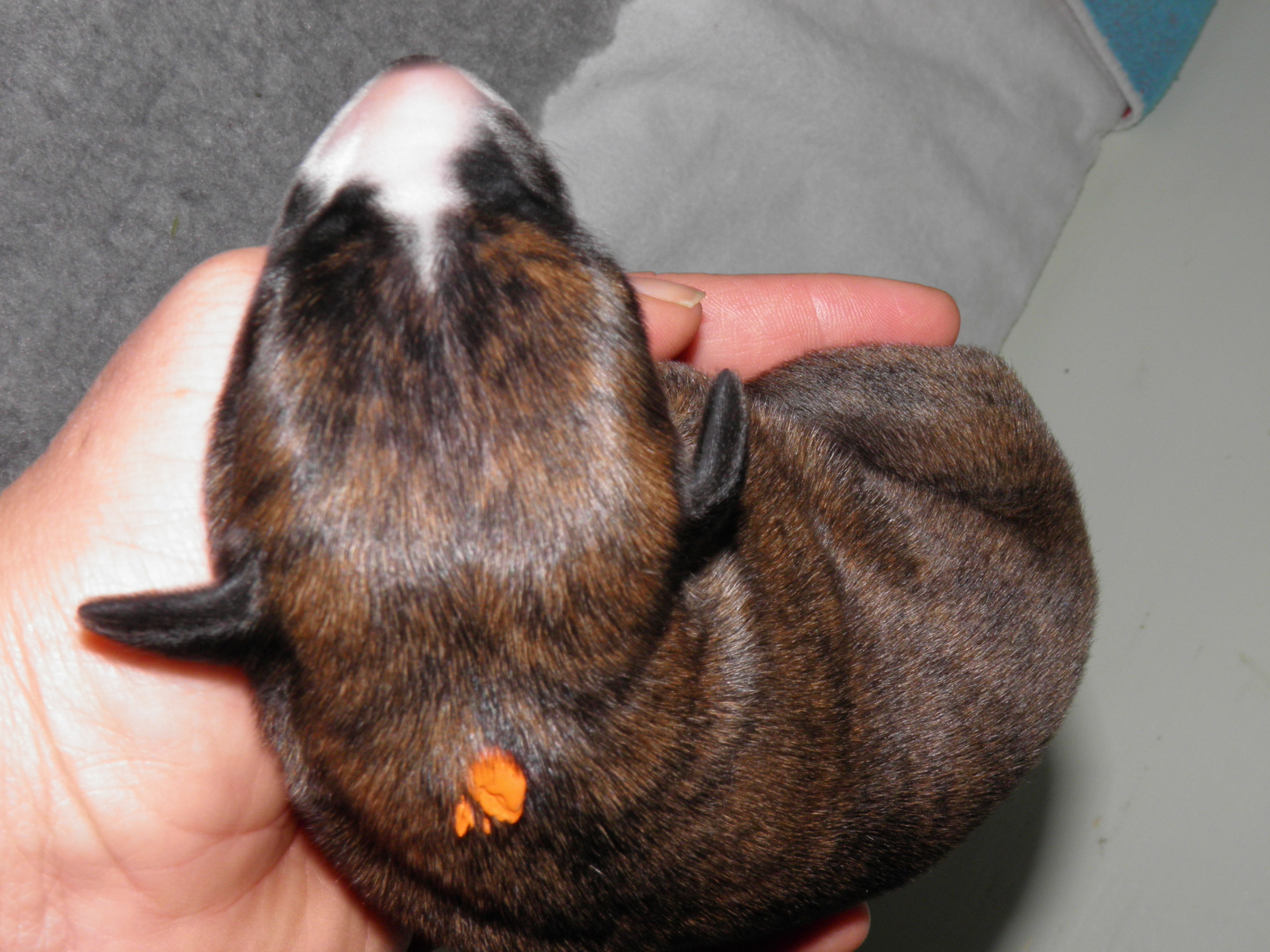1. Hündin 288g sand blaugestromt, kleine weiße Abzeichen, gekennzeichnet mit rotem Tupfen im Nacken 2. Hündin 304g sand blaugestromt, breite Blesse, kl. Abz.,gekennzeichnet mit gelbem Tupfen im Nacken 3. Rüde 350g rot schwarzgestromt, Blesse, kl. Abz.,gekennzeicnet mit orangem Tupfen im Nacken 4. Rüde 290g rot schwarzgestromt, Blesse, kl. Abz., gekennzeichnet mit hellblauem Tupfen im Nacken 5. Hündin 304g sand blaugestromt, kl. Abz., gekennzeichnet mit orangem Tupfen am Po 6. Rüde 291g rot schwarzgestromt, kl. Abz., gekennzeichnet mit weißem Tupfen im Nacken 7. Hündin 302g sand blaugestromt, kl. Abz., gekennzeichnet mit grünem Tupfen im Nacken